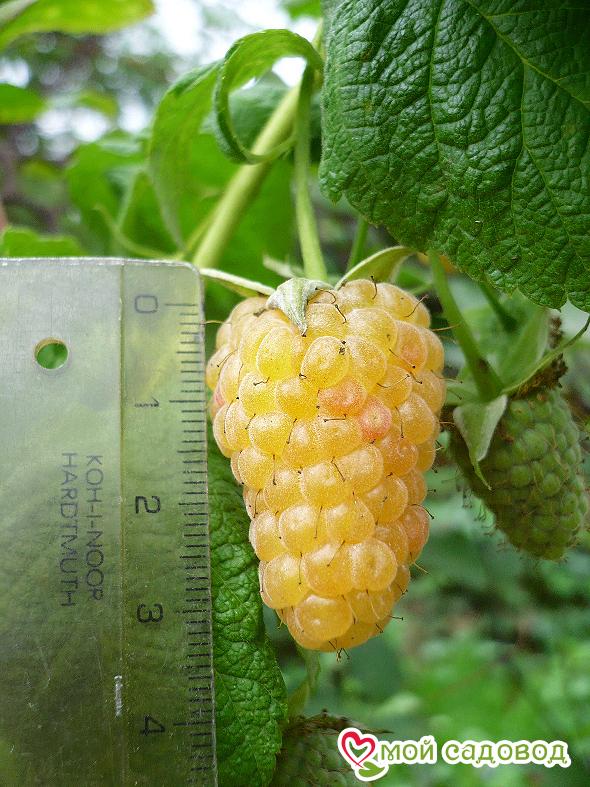Классический сорт желтоплодной малины раннего срока созревания. Куст мощный, высотой 2 — 2,3 м. Образуется 8 — 10 побегов замещения, но куст сохраняет компактность и не разваливается. Молодые побеги без шипов, на старых — в небольшом количестве. Склонен к сильному ветвлению плодовых веток: до 4 — 5 порядка. Интенсивное развитие корневой поросли. Основное плодоношение на прошлогодних побегах, но в благоприятных условиях возможна вторая волна плодоношения на верхушках молодого прироста. Янтарно-желтые годы ширококонические с тупой вершиной, длиной до 4 см и массой 8 — 10 г. Урожайность с одного куста превышает 4 кг. Из-за плохой транспортабельности используются только для личного употребления. В Средней полосе проявляет недостаточную зимостойкость и требует дополнительной защиты. Побеги гибкие и легко пригибаются для зимнего укрытия. Основные плюсы: десертный вкус ягод крупноплодность редкие, небольшие шипы