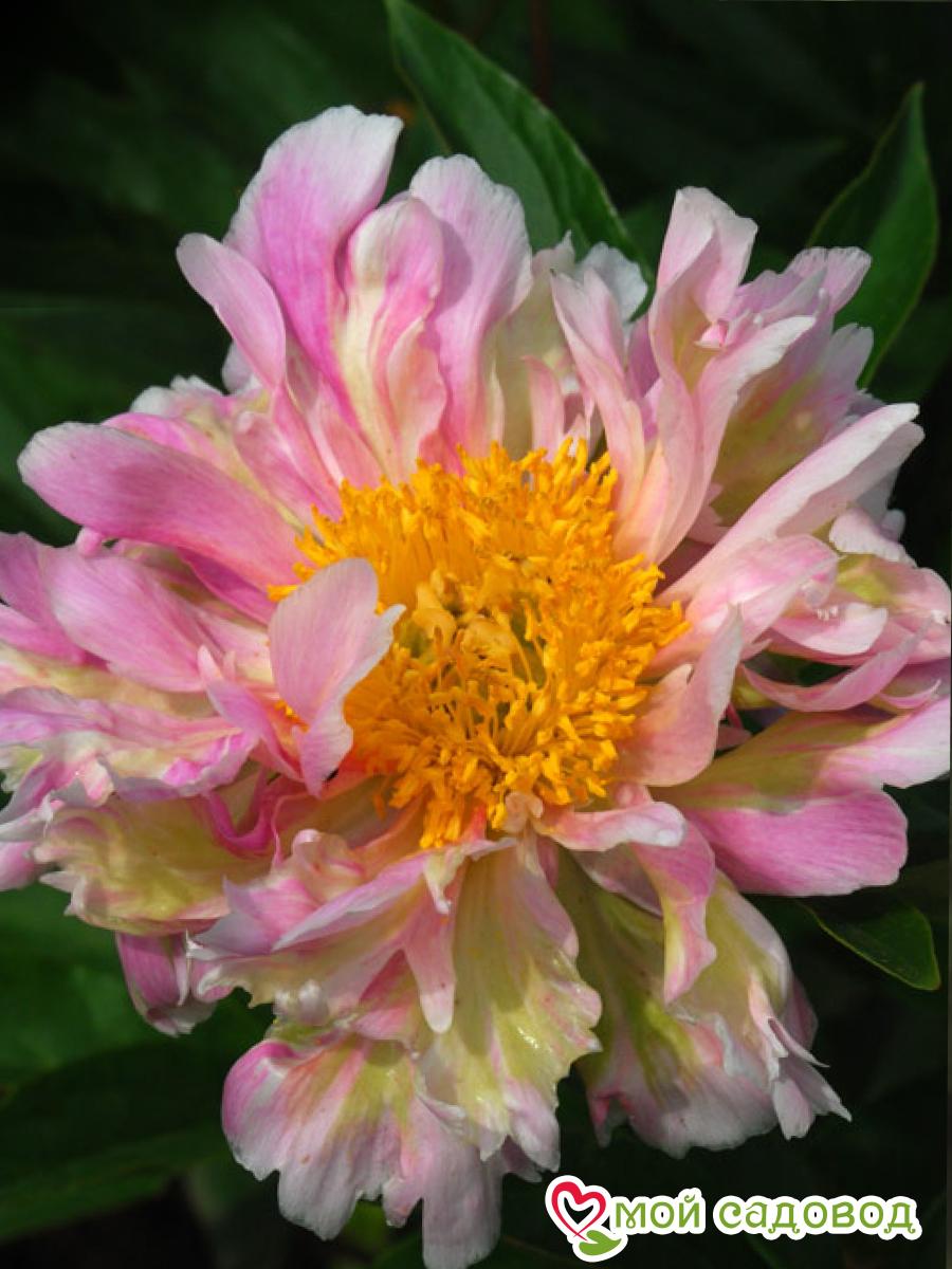 Читать далееПион молочноцветковый Пинк Спритзер — Цветок полумахровый, кактусовидного типа, розовый с со светло-зелёными, зелёными и розовыми полосками. Лепестки волнисто-изогнутые. Листья узкие, тёмно-зелёные. Цветоносы сильные, несут по 1-2 цветка. Высота 75 см.
